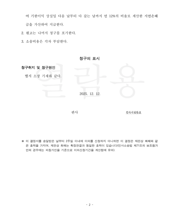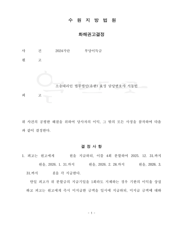 저는 즉각 입금 받은 자들을 피고로 하여 민사소송 부당이득반환청구소송을 제기하였고 소장을 받은 피고가 저희에게 연락하여 청구액을 분납하겠으니 합의하자고 하여 법원은 위와 같은 내용의 화해권고결정을 내려 확정되었습니다.