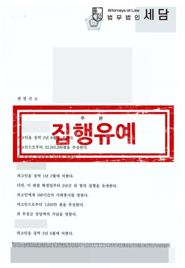 여러 명의 피고인이 함께 재판을 받은 사건이었지만, 의뢰인은 유일하게 집행유예를 선고받았습니다. 실형을 피하고 가족 곁으로 돌아갈 수 있었고, 스스로 잘못을 돌아보며 다시 삶을 정리할 수 있는 기회를 얻었습니다.