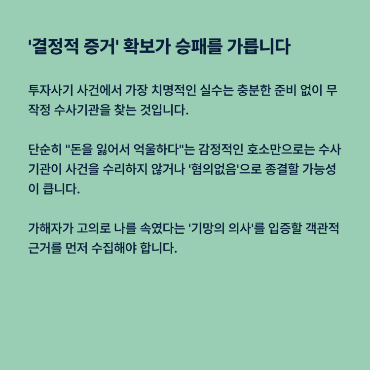 투자사기 사건에서 가장 치명적인 실수는 충분한 준비 없이 무작정 수사기관을 찾는 것입니다. 단순히 "돈을 잃어서 억울하다"는 감정적인 호소만으로는 수사기관이 사건을 수리하지 않거나 '혐의없음'으로 종결할 가능성이 큽니다. 가해자가 고의로 나를 속였다는 '기망의 의사'를 입증할 객관적 근거를 먼저 수집해야 합니다.