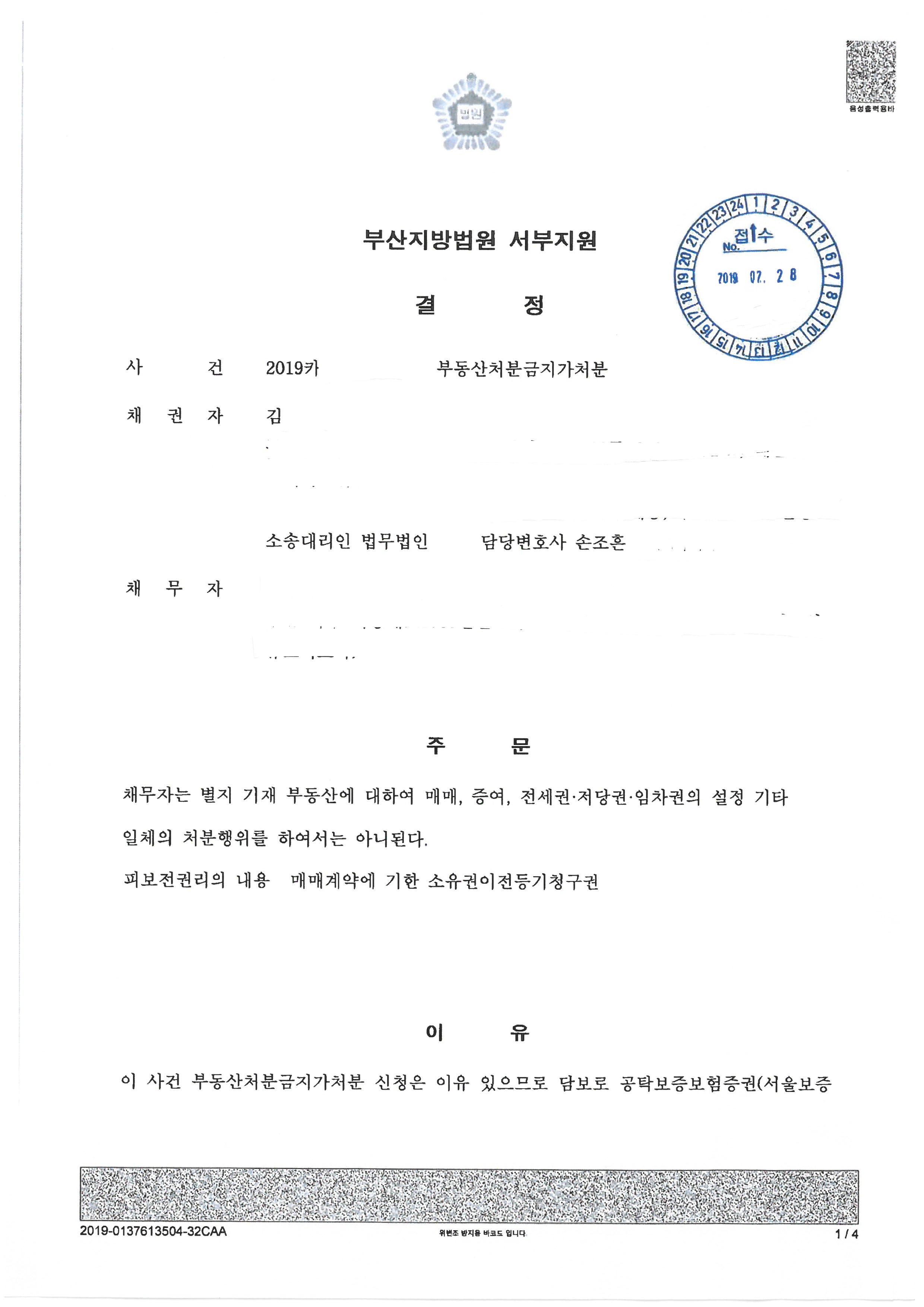 처분금지가처분의 경우 상대방이 처분할 조짐을 보일 때에 착수하게 되는 경우가 많고, 이 사건 역시 그러한 경우인지라 보정에 따른 시간 소요가 없도록 신속한 절차진행 필요하였습니다. 이에 손조흔 변호사는 의뢰인과 밀도높은 상담을 하고 계약관련 자료를 전달받아, 이를 바탕으로 상담직후 바로 가처분신청을 하였습니다.