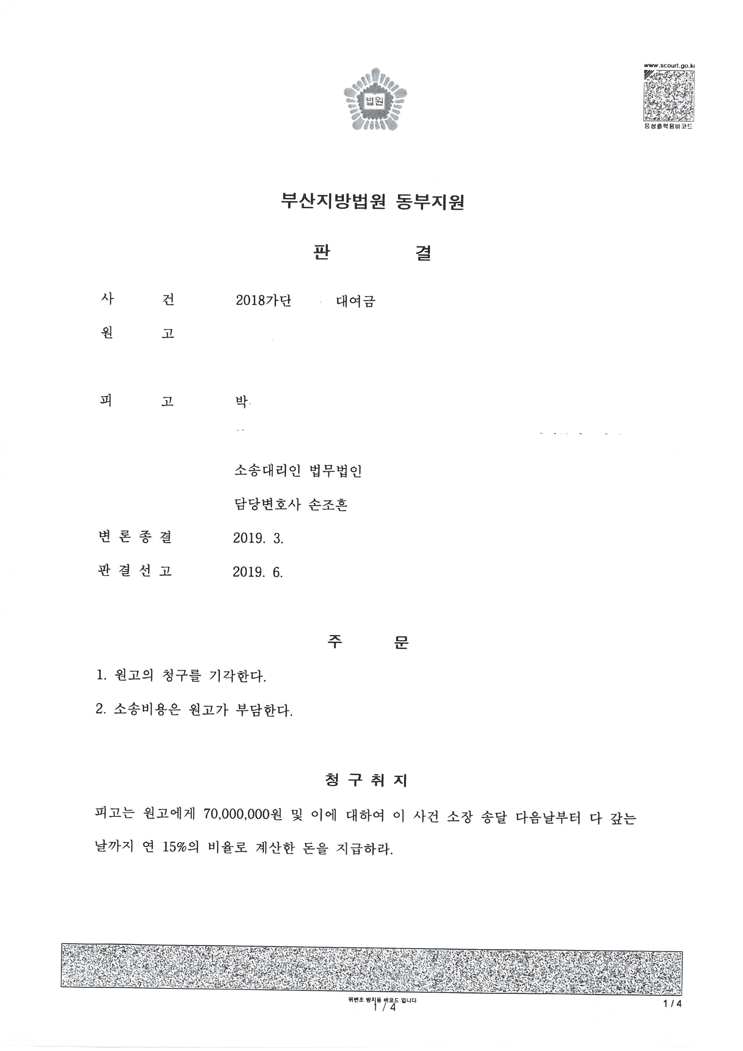 그 결과 법원은 손조흔 변호사의 주장을 모두 받아들여 원고의 청구를 기각하였고, 원고는 항소를 포기하였습니다.