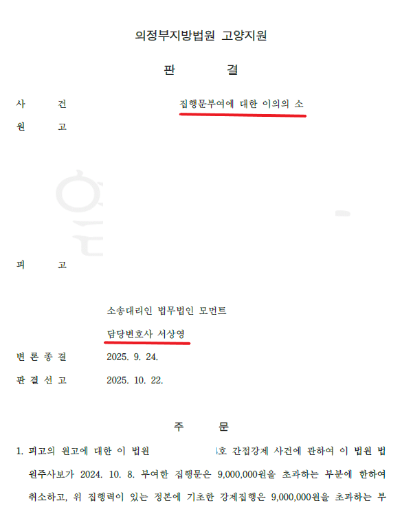 주말 이행 부분을 제외한 나머지 부분에 대하여 의뢰인의 주장을 받아들여 승소 판결을 선고하였습니다.이에 따라 의뢰인은 집행문에 기초한 강제경매 절차를 계속 진행할 수 있게 되었고, 법인의 형식적인 대응과 집행 회피 시도를 법적으로 차단하는 데 성공하였습니다.