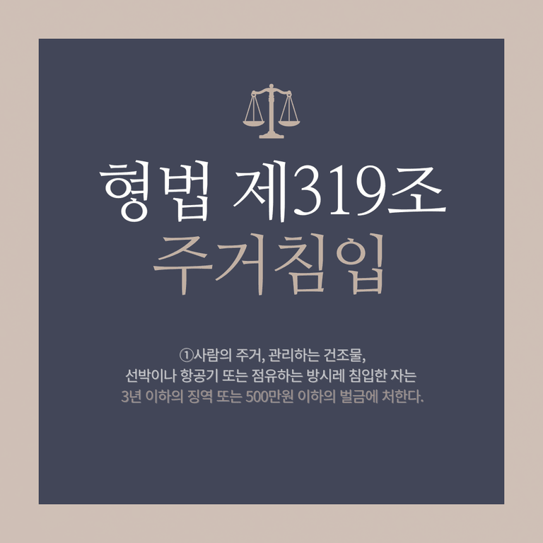 제319조(주거침입, 퇴거불응) ①사람의 주거, 관리하는 건조물, 선박이나 항공기 또는 점유하는 방시레 침입한 자는 3년 이하의 징역 또는 500만원 이하의 벌금에 처한다.
