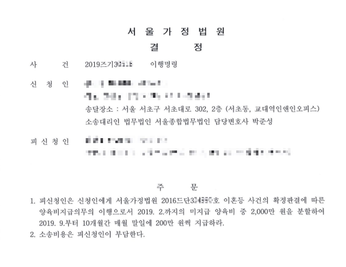 가정법원에서는 본 변호사의 신청에 따라 상대방에게 미지급 양육비를 분할하여 지급할 것을 명하였고,
