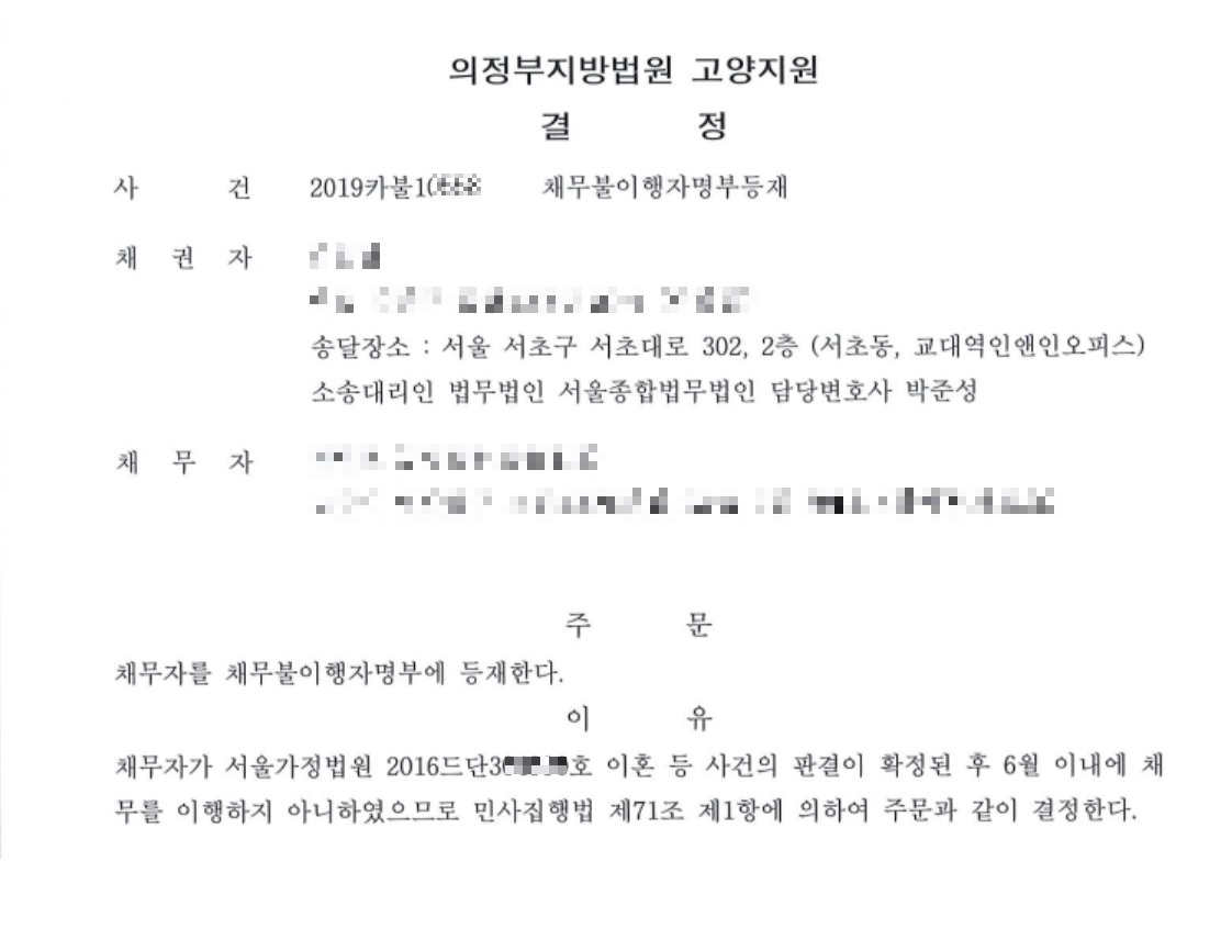 ![[양육비.위자료] 3년간 꼼짝않던 채무자에게 전액 추심 성공](/_next/image?url=https%3A%2F%2Fd2ai3ajp99ywjy.cloudfront.net%2Fuploads%2Ftitleimage%2Foriginal%2F5c233429c2f7a4a918c08df0-original.jpg&w=3840&q=75)