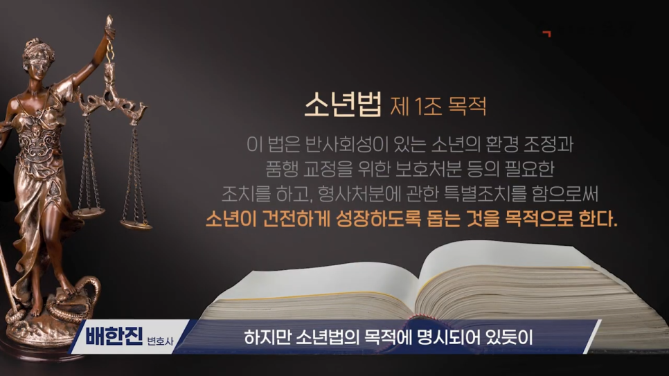 성인 범죄가 '지은 죄에 대한 합당한 처벌'에 방점이 찍혀 있다면, 소년법은 '반사회성이 있는 소년의 환경 조정과 품행 교정을 통한 건전한 성장(교화)'을 목적으로 합니다.
