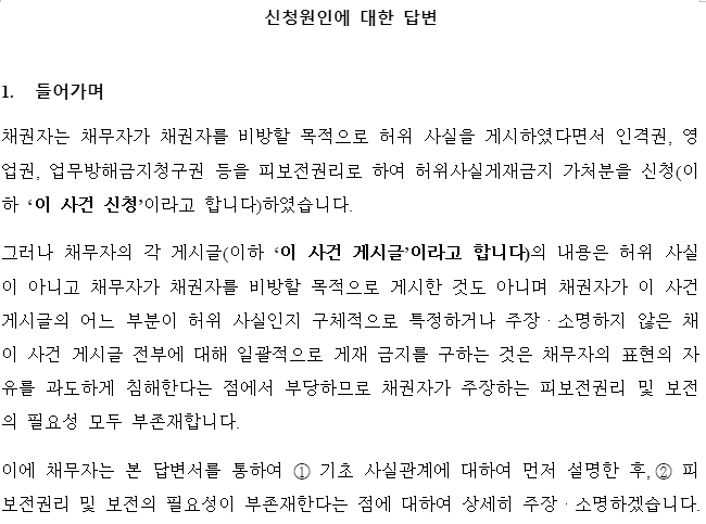허위사실게재금지 가처분을 신청한 사안입니다.