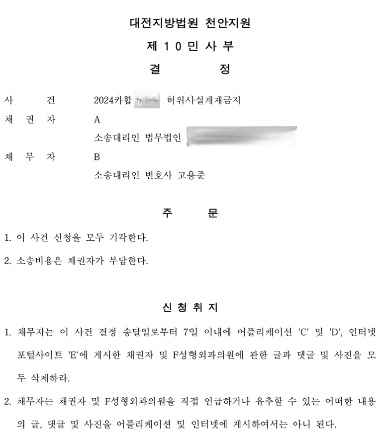 허위사실게재금지 가처분 신청은 기각되었습니다.