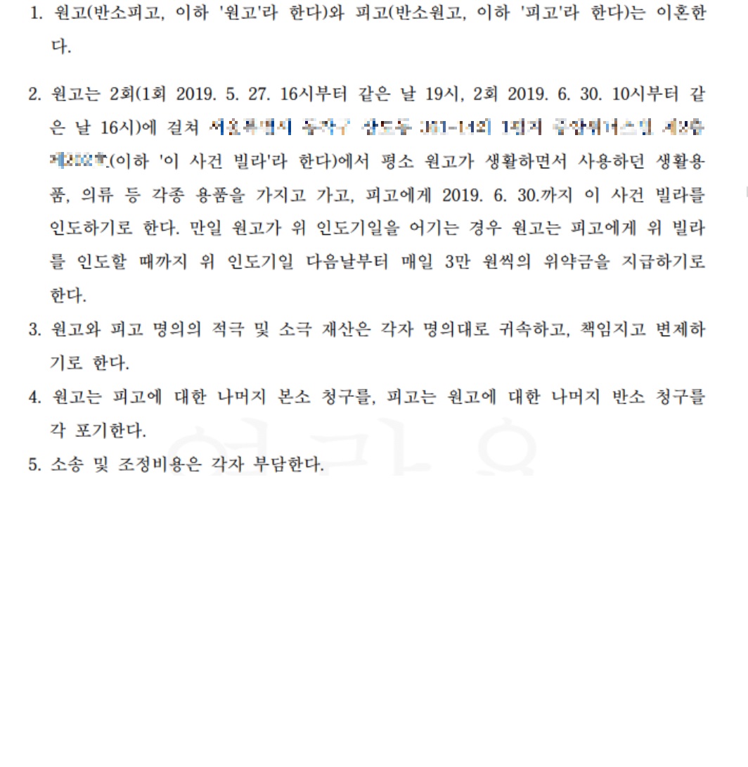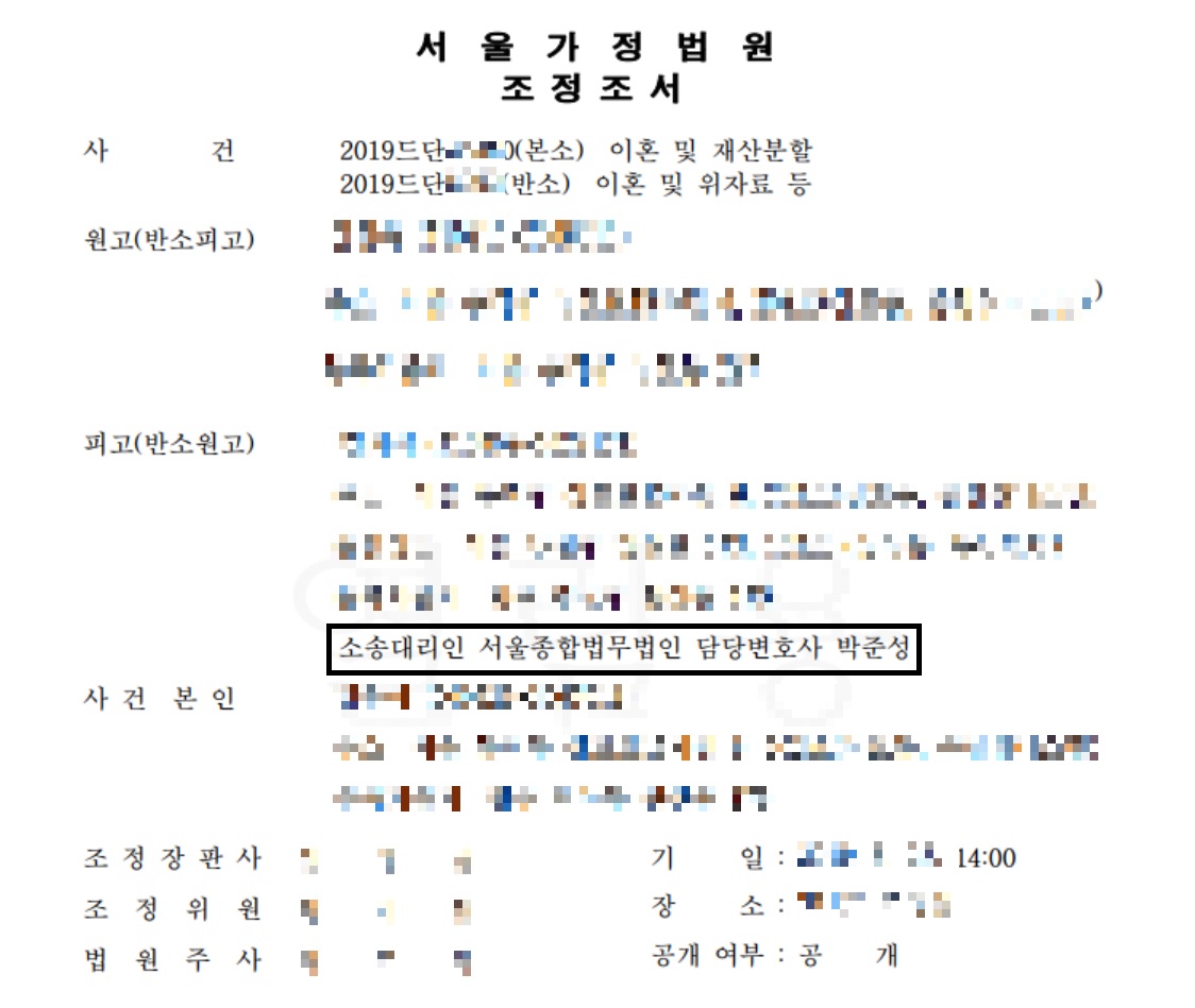 조정기일이 잡히게 되어 본 변호사는 의뢰인과 함께 출석하여 상대방 주장의 부당함을 적극 주장하였고, 결국 상대방의 주장은 전부 받아들여지지 아니한 채 양당사자가 원만하게 이혼에 합의하는 것으로 종결시켰고, 상대방을 시한 내에 퇴거시키는 조항도 포함시켜 조정 성립에 성공하였습니다.