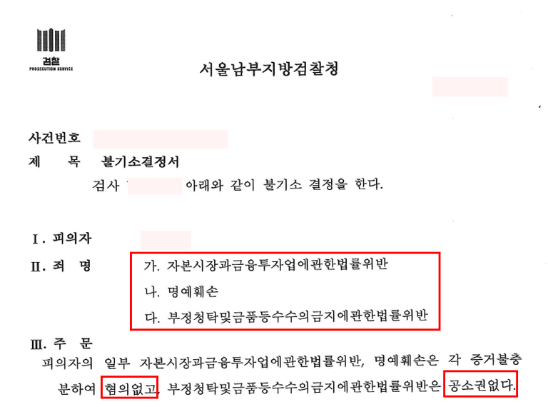 ![[자본시장법, 명예훼손, 청탁금지법] 검찰 - 불기소](/_next/image?url=https%3A%2F%2Fd2ai3ajp99ywjy.cloudfront.net%2Fuploads%2Ftitleimage%2Foriginal%2F5d8e194e262a65bfeb4268f0-original.jpg&w=3840&q=75)