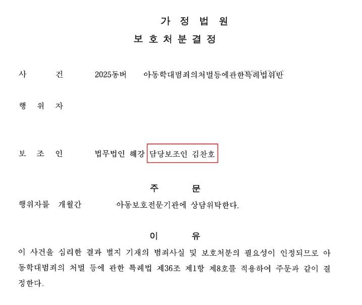 저희 사무소에서는 아동학대혐의로 수사를 받은 피의자를 변호하였고, 최근 법원은 가장 가벼운 보호처분인 아동보호전문기간 상담위탁 처분을 하였습니다.