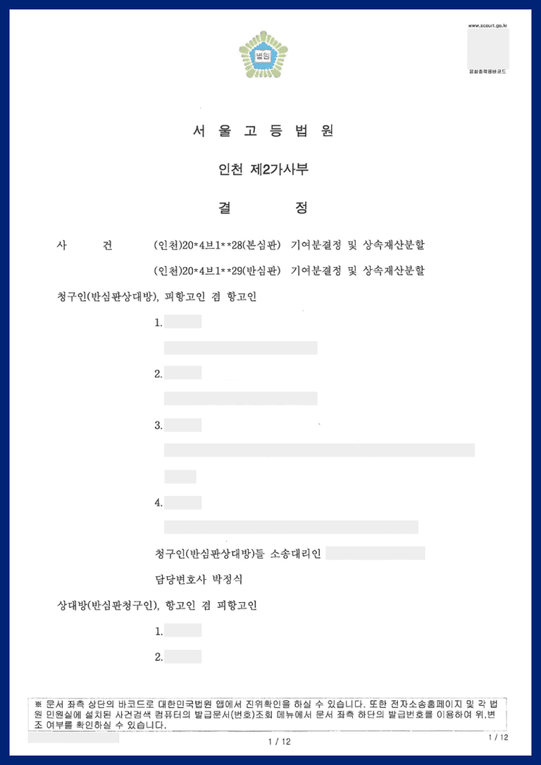 1. 기여분 비율에 대하여는 민법 제1008조의2에서 정한 기여분 제도는 공동상속인 중에 피상속인을 특별히 부양하였거나 피상속인의 재산의 유지 또는 증가에 관하여 특별히 기여하였을 경우 이를 상속분 산정에 고려함으로써 공동상속인 사이의 실질적 공평을 도모하려는 것인바(대법원 2014. 11. 25.자 2012스156, 157 결정), 청구인이 부동산 대지를 매수하고 건물 건축비용을 부담하였으며 주도적으로 운영·관리한 점을 인정하여 기여분 50%를 인정하였습니다.