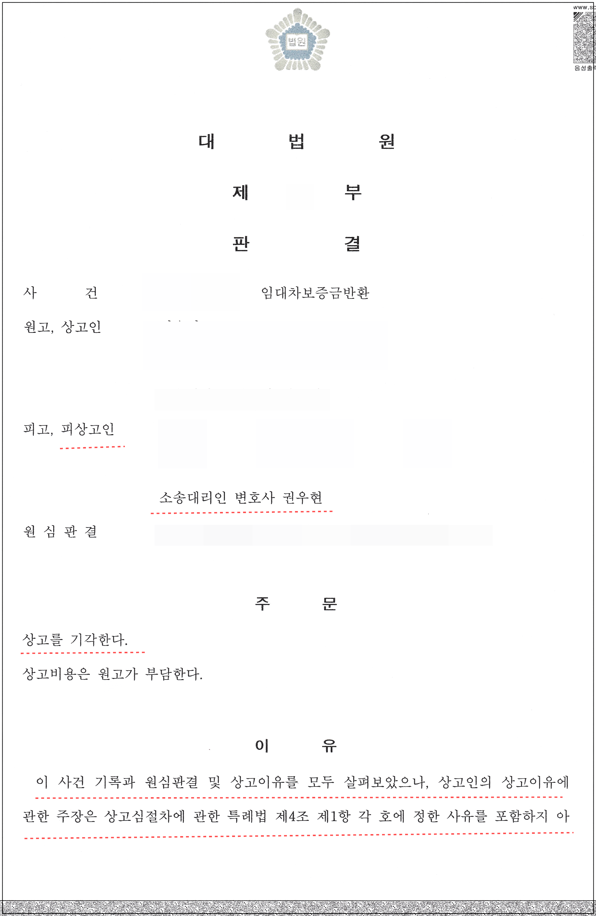 상고심은 하급심이 사실임인 것과는 달리 법률심이므로 원심판결의 법적하자를 아주 잘 정리하여 상고이유서에 담아야 합니다. 그런데 상고대리인들이 이를 잘 이해하지 못하거나 노력의 부족으로 사실심의 준비서면처럼 상고이유서를 적는 경우가 많은데 이 경우 상고기각을 각오해야 하며, 설령 법적인 하자를 주장하더라도 잘 요약해서 정말 알아보기 쉽게 정리하지 않으면 법적인 하자주장이 없는 것으로 치부되어 아래 판결서 기재와 같이 단 몇줄로서 기각이유를 받을 수 밖에 없습니다.