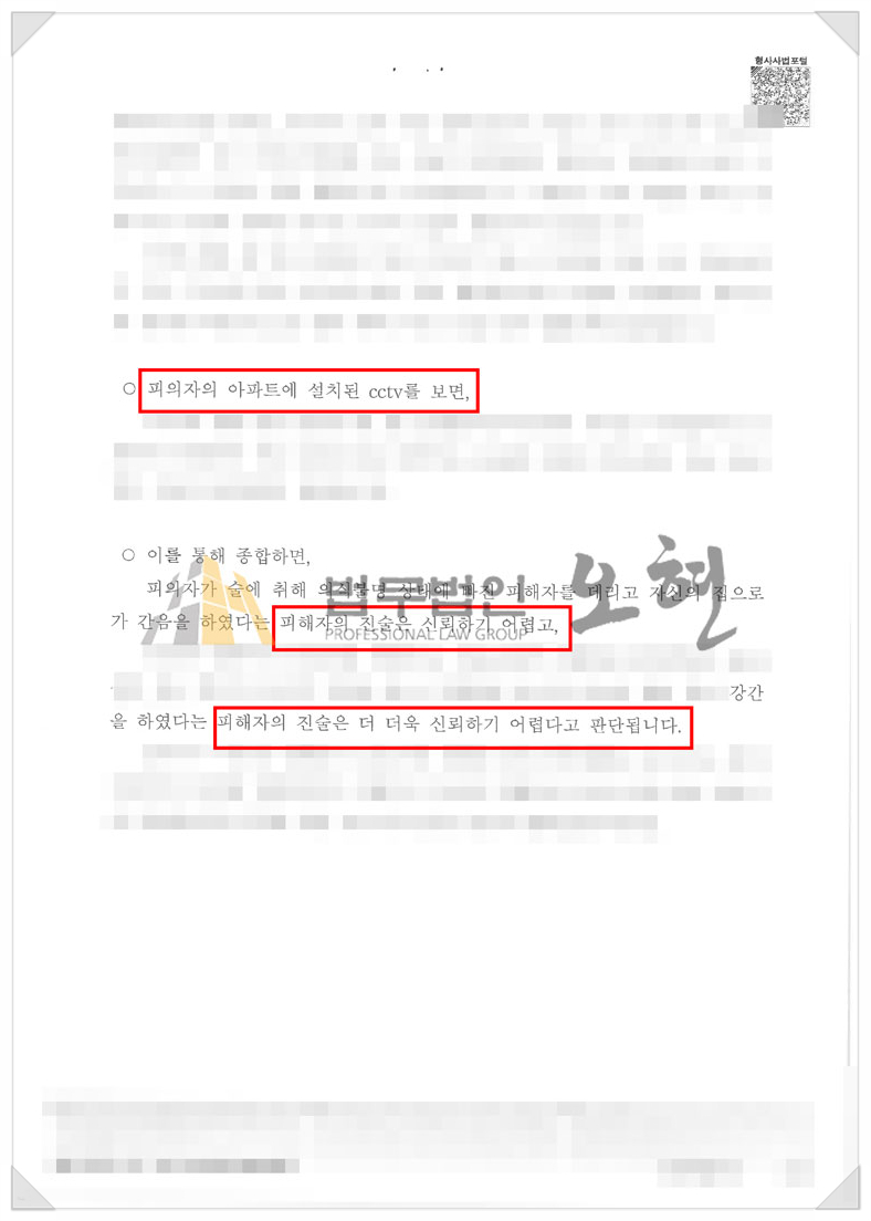 본 법무법인 내 자체적인 디지털포렌식팀을 동원하여 의뢰인과 고소인의 대화내용을 모두 복원하였고, 병원 및 의뢰인 아파트 엘레베이터의 cctv까지 모두 확보하여 분석하였습니다.