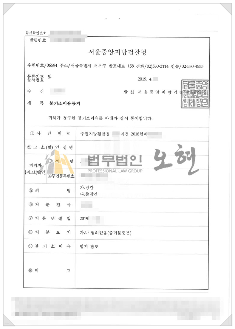 검찰은 변호인이 주장한 바와 같이, 의뢰인과 고소인이 병원장과 간호사의 관계를 넘어 연인관계로 보여진다는 점, 피의자로부터 강간을 당하였다는 피해자의 진술은 피해자의 진술 외에 달리 혐의를 입증할만한 증거가 없다는 점 등을 이유로 의뢰인에게 무혐의 처분을 내렸습니다.