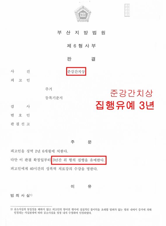 ✏️재판부는 피해자와 원만히 합의한 점을 참작하여 징역 2년 6개월에 처하나 3년간의 집행 유예를 선고하였습니다.
