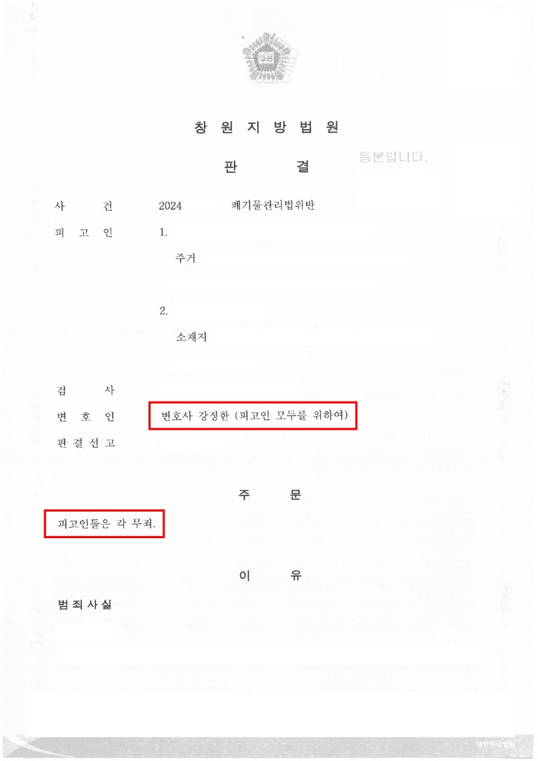 폐기물관리법 위반 항소심 무죄 성공사례