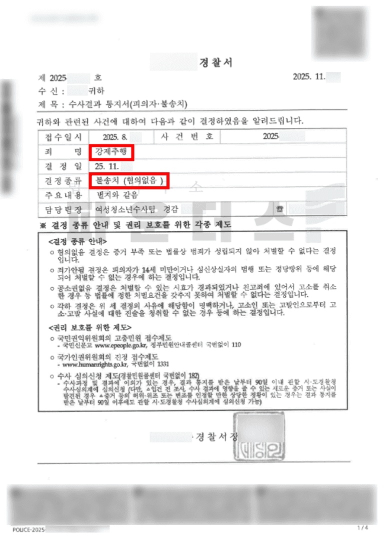 그 결과, 의뢰인은 친한 친구의 가슴과 엉덩이를 추행했다는 강제추행 사건에서 불송치 결정을 받아 억울한 누명에서 벗어나 소중한 일상을 되찾을 수 있었습니다.