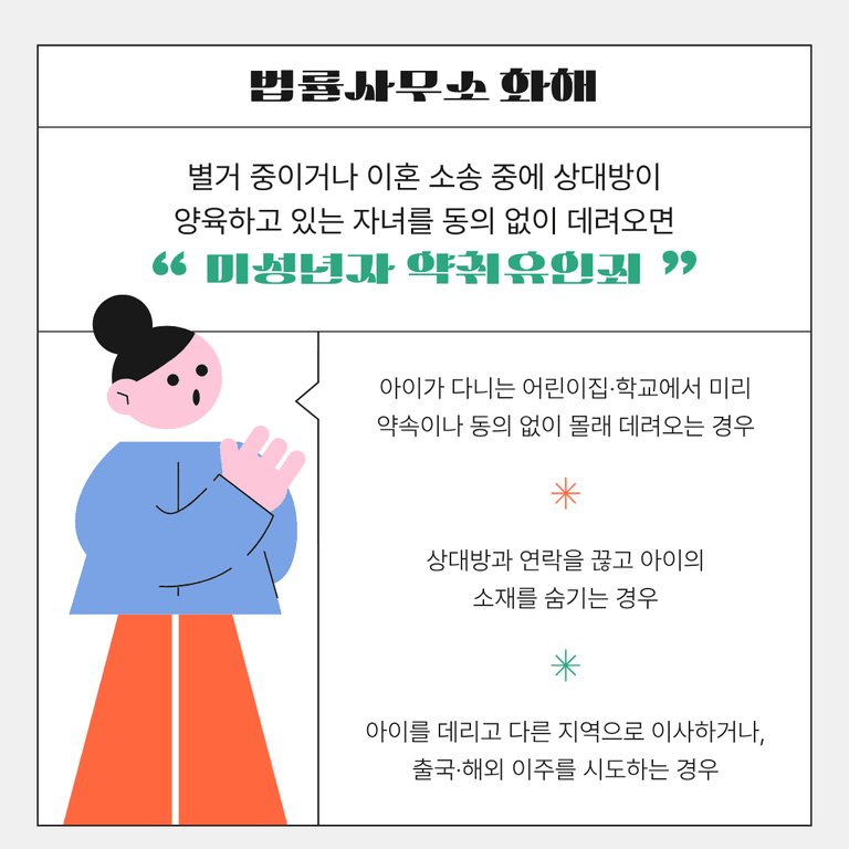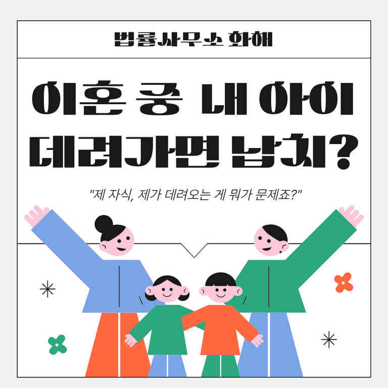 결국, 이혼 도중이라고 해서 예외가 되는 것이 아니라, 오히려 분쟁이 치열한 시기인 만큼 한 번의 행동이 형사 책임까지 이어질 수 있어 더욱 주의가 필요합니다. 구체적인 사실관계에 따라 범죄 성립 여부는 달라질 수 있지만, ‘내 아이니까’라는 이유만으로 상대방과 협의 없이 데려오는 행동은 법적으로 매우 위험한 선택입니다.