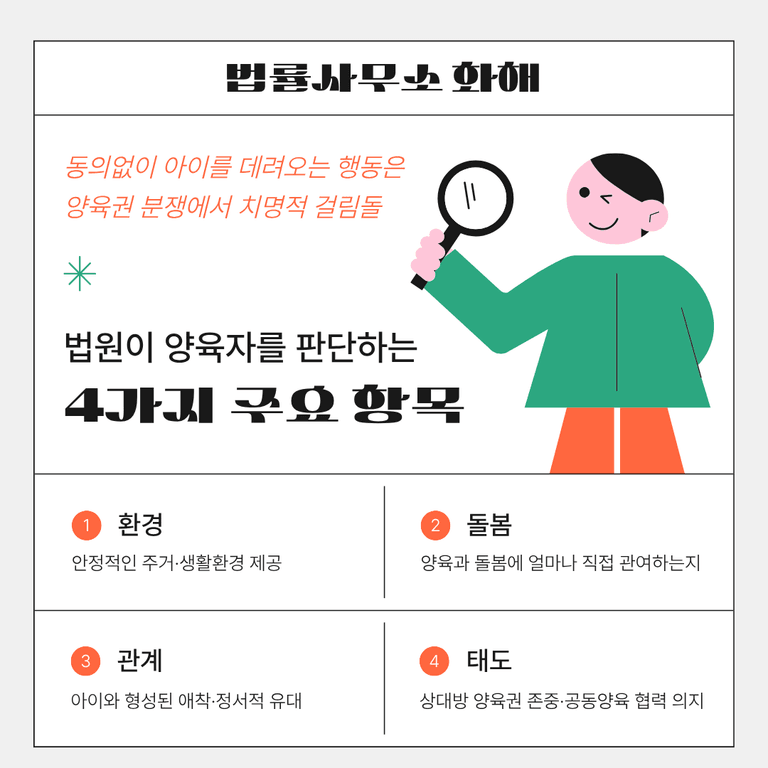 법원은 이혼 소송에서 양육자를 정할 때 “누가 혼인 파탄에 더 잘못이 있는가”가 아니라, “누가 아이의 복리와 안정적인 양육 환경을 더 잘 보장할 수 있는가”를 기준으로 판단합니다. 이혼 도중에 감정이 격해져 아이를 데려오는 행동은, 이 기준에서 보았을 때 상당히 악영향을 미칠 수 있습니다.