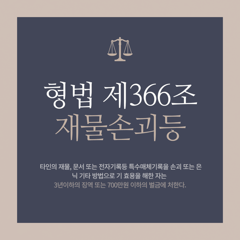 제366조(재물손괴등) 타인의 재물, 문서 또는 전자 기록 등 특수매체기록을 손괴 또는 은닉 기타 방법으로 기 효용을 해한 자는 3년이하의 징역 또는 700만원 이하의 벌금에 처한다.