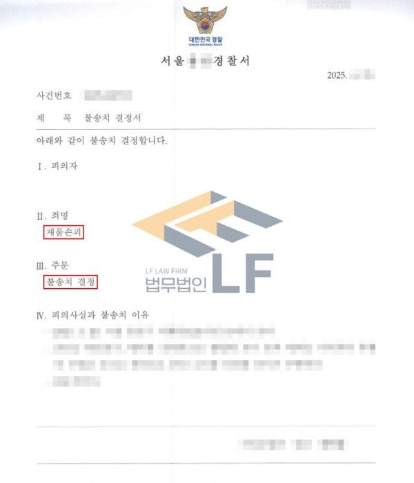 이러한 노력 끝에 의뢰인은 재물손괴 혐의에 대해서는 경찰로부터 불송치 처분을 받아 볼 수 있었습니다.