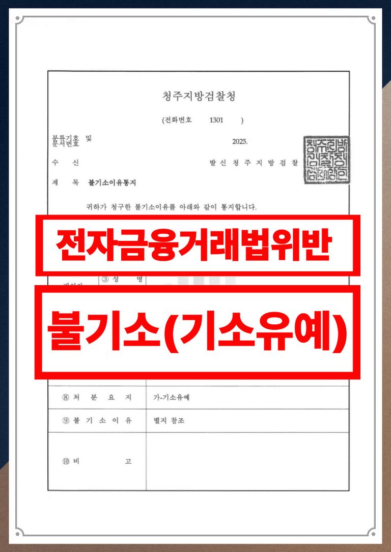 그 결과 수사기관은 의뢰인이 보이스피싱 사기 범행과는 관련이 없었다는 점을 인정하여, 당초 적용되었던 사기죄 및 사기방조 혐의가 아 닌 전자금융거래법 위반으로만 기소 의견 송치를 하였습니다. 이후 검찰은 사건의 경위와 정상관계를 종합적으로 고려해 의뢰인에게 전과가 남지 않는 기소유예 불기소처분을 내렸고, 의뢰인은 형사처벌 없이 사건을 마무리할 수 있었습니다.
