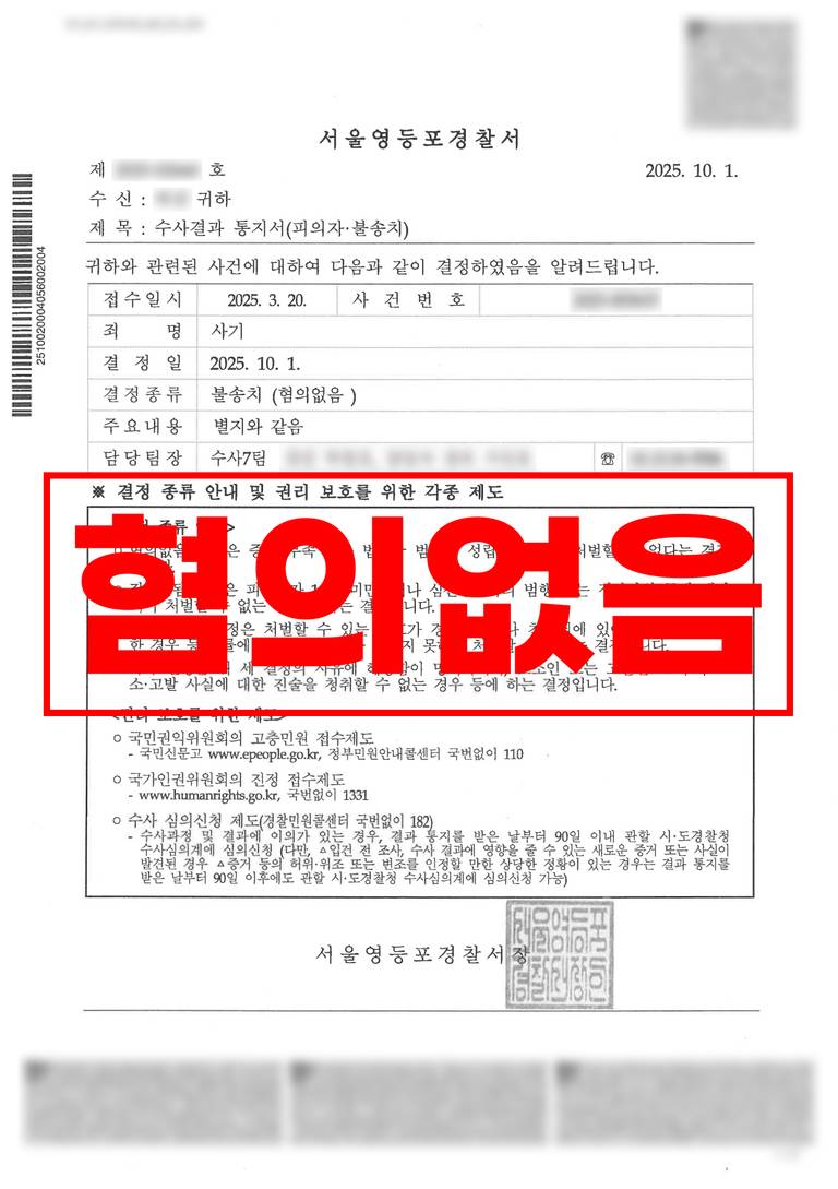 그 결과, 의뢰인이 고소당했던 모든 사건에 대해 불송치(혐의없음) 결정이 내려졌습니다.