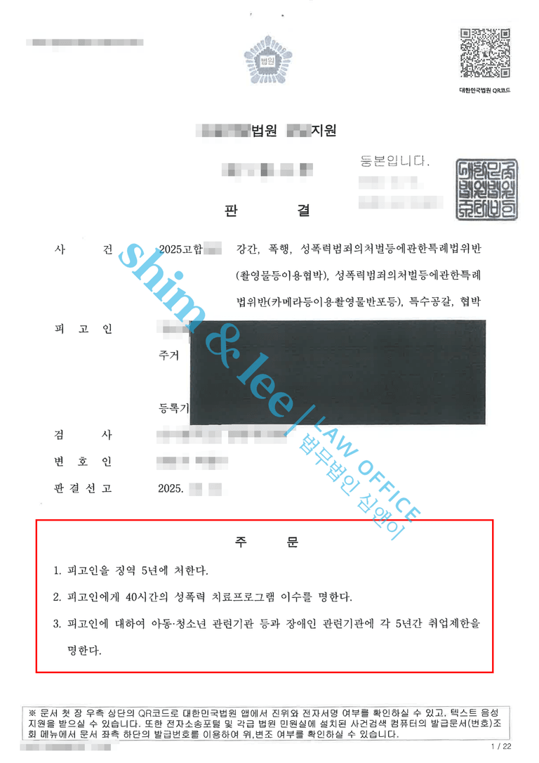 - 최종적으로 재판부는 피고인에게 징역 5년, 성폭력 치료강의 40시간, 취업제한 5년을 선고했으며, 추가 피해를 예방하기 위한 조치로 범행에 사용된 피고인의 휴대폰을 몰수했습니다.