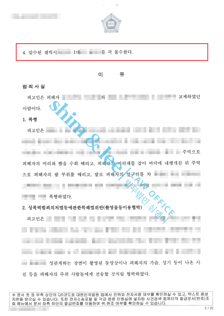 - 가해자는 꾸준하게 피해자에게 ‘내가 널 그대로 둘 것 같아?’라는 말을하며 보복을 암시해 왔는데, 압수된 휴대폰에는 피해자와 그 가족들의 개인정보와 집 주소 등이 저장되어 있어 실제로 보복을 할 가능성이 높다고 주장했습니다. 또한 실제로 가해자는 피해자의 가족들에게 보복할 우려가 높다는 점이 인정되어 구속까지 이루어졌기 때문에 압수물 가환부는 결코 허용되어서는 안된다고 강력히 요청했고 결국, 피고인의 압수물 가환부 신청에 대한 기각 결정을 이끌어냈습니다.