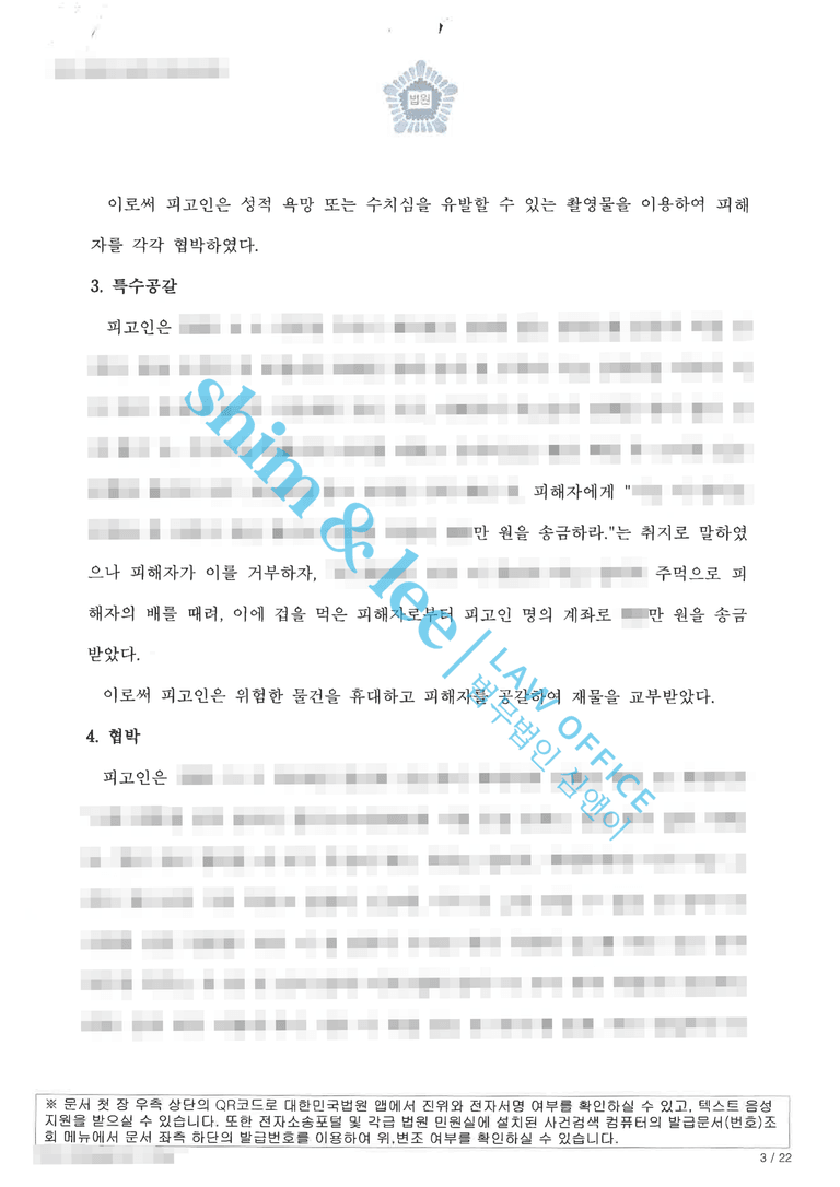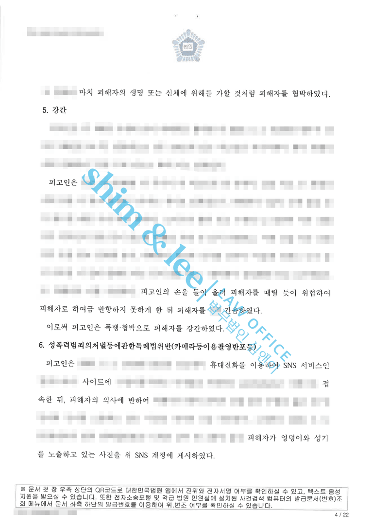 - 심앤이는 선고기일을 앞두고 두 차례 변호사 의견서를 제출하여 피해자 진술의 신빙성과 무고로 보기 어려운 고소 경위, 피고인 범행의 중대성을 다시 한번 강조해서 피고인의 강간, 폭행, 촬영물 이용 협박, 촬영물 반포, 특수공갈, 협박 혐의에 대해 법정 구속 실형을 간절히 요청했습니다.