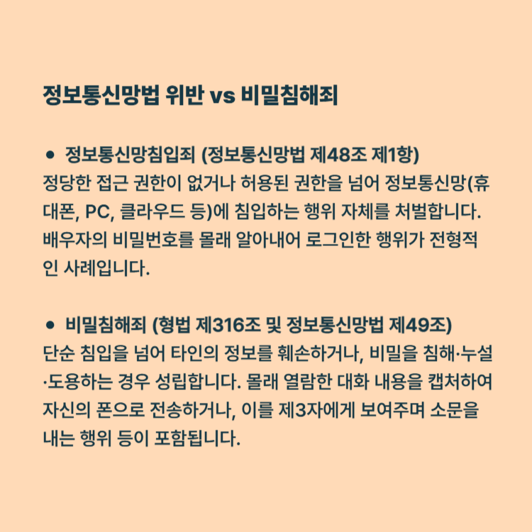 정보통신망침입죄 (정보통신망법 제48조 제1항): 정당한 접근 권한이 없거나 허용된 권한을 넘어 정보통신망(휴대폰, PC, 클라우드 등)에 침입하는 행위 자체를 처벌합니다. 배우자의 비밀번호를 몰래 알아내어 로그인한 행위가 전형적인 사례입니다.