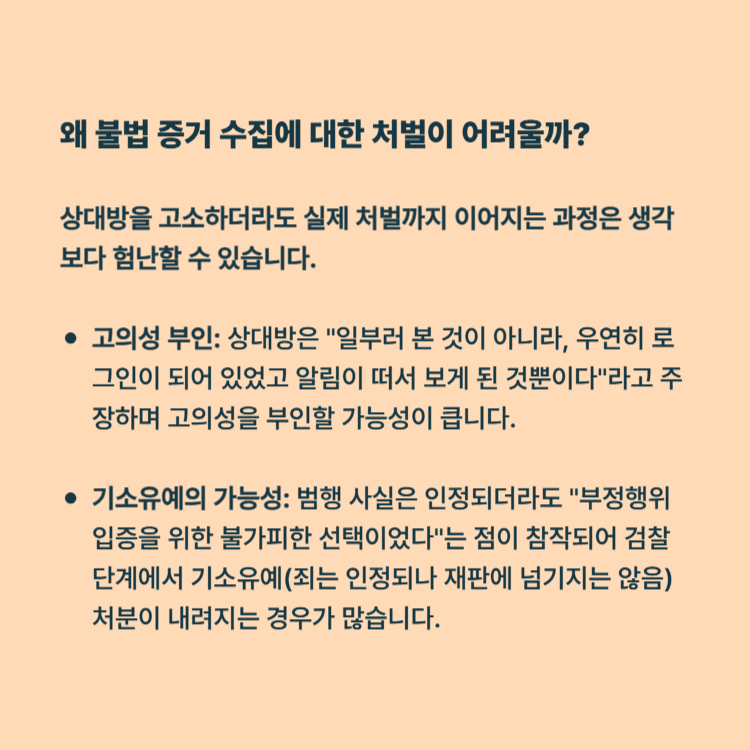 기소유예의 가능성: 범행 사실은 인정되더라도 "부정행위 입증을 위한 불가피한 선택이었다"는 점이 참작되어 검찰 단계에서 기소유예(죄는 인정되나 재판에 넘기지는 않음) 처분이 내려지는 경우가 많습니다.