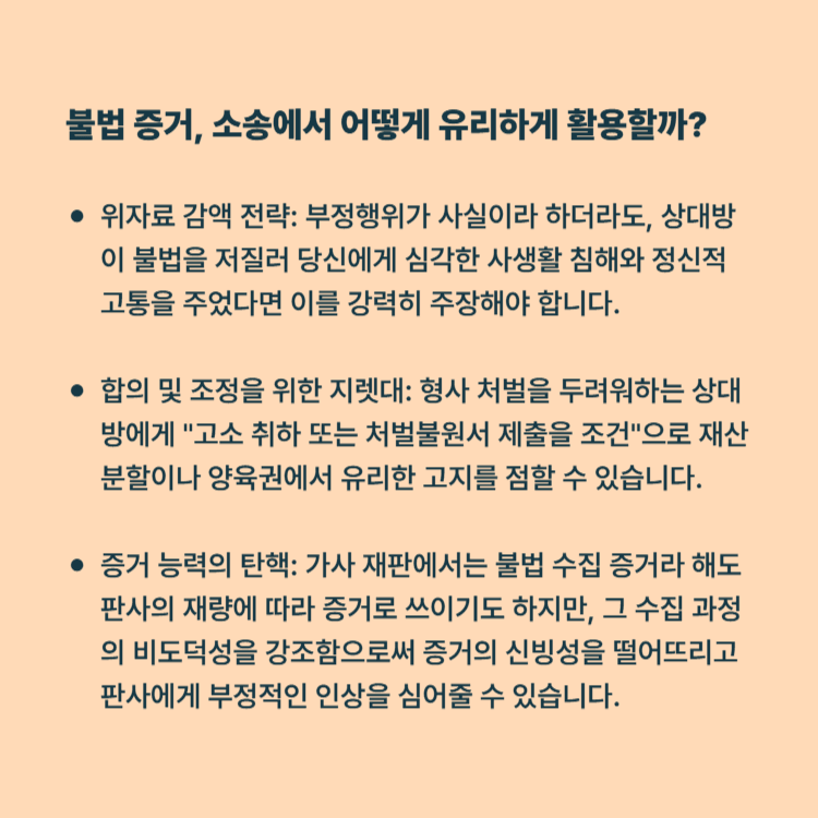 증거 능력의 탄핵: 가사 재판에서는 불법 수집 증거라 해도 판사의 재량에 따라 증거로 쓰이기도 하지만, 그 수집 과정의 비도덕성을 강조함으로써 증거의 신빙성을 떨어뜨리고 판사에게 부정적인 인상을 심어줄 수 있습니다.