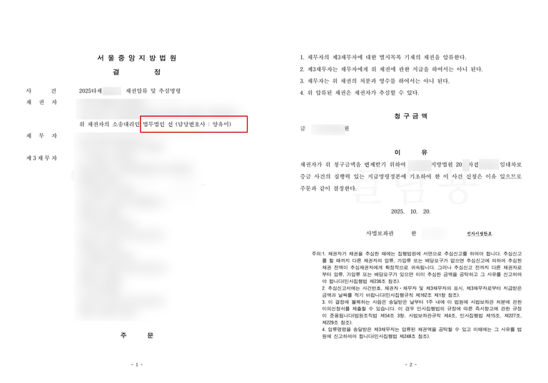➡️ 금융재산의 선제적 압류: 제1금융권 5개 은행의 예금통장을 압류하여 채무자의 자금줄을 묶고 일부 채권을 추심하였습니다.