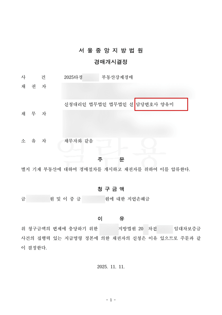 결론적으로 의뢰인은 보증금 원금과 이자는 물론, 일반적인 경매 절차만으로는 회수가 불가능했던 변호사 선임료까지 단 1원의 손실 없이 모두 회수하며 사건을 종결하였습니다.