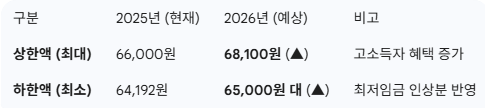 관련 논의에 따르면 2026년 1월 이후 이직자부터는 상한액이 68,100원으로 인상될 가능성이 매우 높습니다.