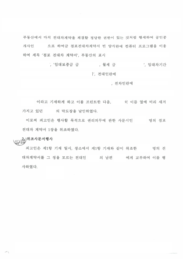 가해자는 의뢰인의 허락 없이 의뢰인이 임차인으로 된 임대차계약서를 위조하고 가지고 있던 의뢰인 도장을 날인하였으며 뒤늦게 사실을 알게 된 의뢰인은 저를 찾아오셨습니다.