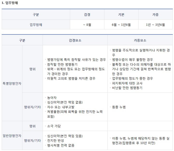 양형위원회 홈페이지에 보면, 죄목별로 양형기준이 자세히 분류되어 있습니다.