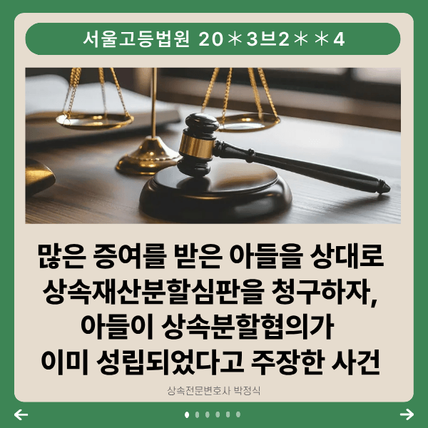 피상속인이 생전에 공동상속인들에게 증여한 현금, 주식 등이 특별수익에 해당하는지, 그리고 이를 반영한 각 상속인의 구체적 상속분은 얼마인지 여부 등이 쟁점이 되었습니다.