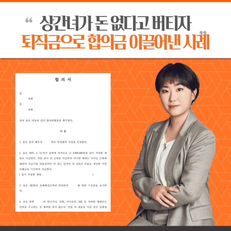 의뢰인께서는 2025. 3월 초 법무법인 새움을 방문하여 선임해 주셨고, 사건 파악 후 2025. 3월 중순 합의 관련 문자를 상대방에게 발송하였습니다. 상간녀와 2025. 4월 초 연락하여 합의 의사 있음을 전달받았고 금액적인 부분에서 자신은 돈이 없다며 300만 원 정도를 생각한다고 하였으나, 의뢰인께서 퇴직금과 급여를 2025. 4월 초에 받을 것이라고 말씀해주셔서 이를 언급하여 설득하였습니다. 급여 및 퇴직금 지급일 다음 날까지 지급하는 것으로 하며 2025. 4월 중 합의가 성립되었습니다.