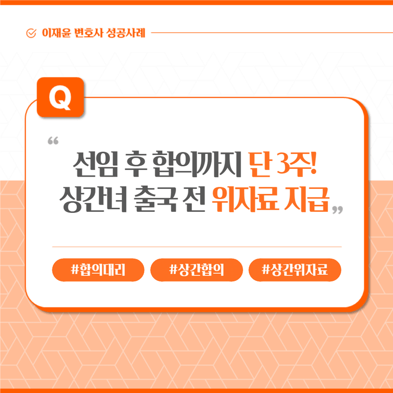 상간녀가 외국인으로 4월 중순 경 출국예정에 있어서 출국 전 합의 및 합의금을 받아야 하는 상황이었습니다. 따라서 회신을 빠르게 달라고 하였고 합의 관련 상간녀의 회신이 없어 명일 바로 합의 의사 있는지 여쭈어보았고 합의 의사 확인하여 합의 대리 진행하였습니다. 출국 전에 더 많은 위자료를 받으실 수 있도록 조력하였습니다.