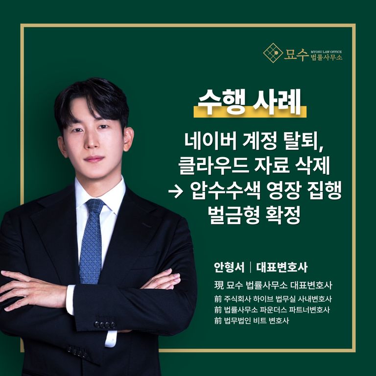 묘수 법률사무소는 전 연인의 네이버 계정을 동의 없이 탈퇴시켜 클라우드에 저장된 업무 자료 등을 모두 삭제한 피의자에 대하여 형사 고소를 진행, 유죄(벌금형) 판결을 이끌어 냈습니다.