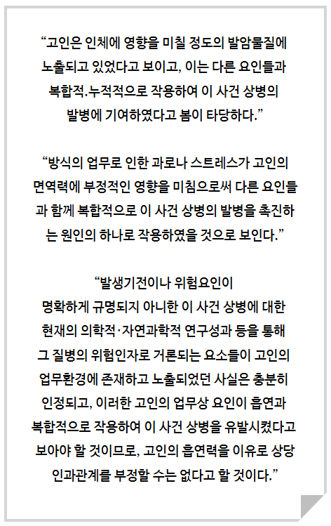 이에 법원은 유해물질 노출, 야간 교대근무 등이 복합적으로 작용한 점을 지적했습니다.