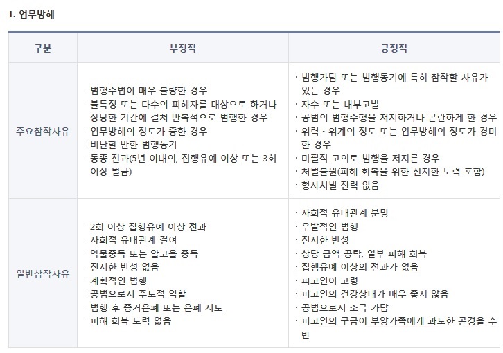 양형기준에서는 집행유예 참작의 긍정적 사유와 부정적 사유를 구분하고, 긍정적 요소와 부정적 요소 내에서도 집행유예 결정에 대한 영향력의 정도에 따라 주요참작사유와 일반 참작사유로 구분하고 있습니다.