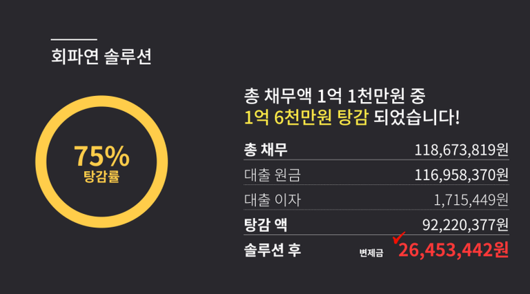 - 법원에서는 의뢰인의 채무가 다액이고 변제율이 낮은 점을 감안하여 추가 변제재원을 마련하여 변제율을 대폭 상향하라는 권고를 했으나 의뢰인이 어린 두 자녀를 양육하며 사업장을 운영하고 있으므로 변제 재원을 마련하기 어렵고, 배우자 또한 개인회생을 진행하고 있는 점을 어필하여 변제기간 만을 상향하여 원금의 75%를 탕감 받는 변제계획안으로 인가를 받았습니다.