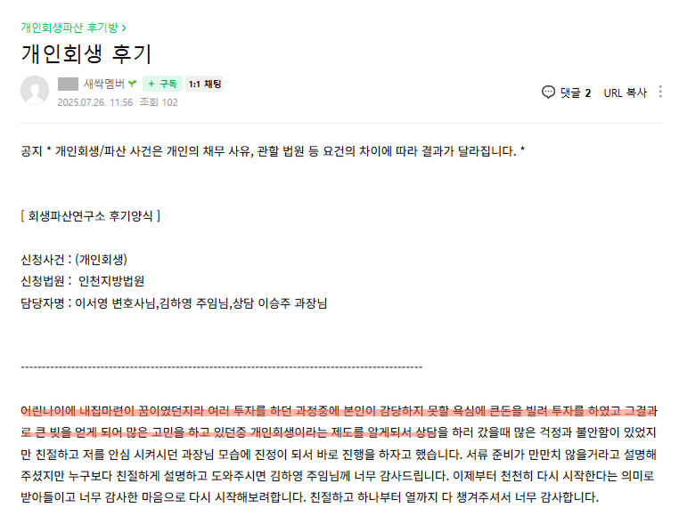 법률사무소 우인 개인회생 후기