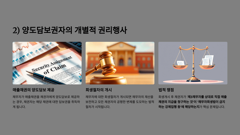 문제는 채무자가 매출채권을 채권자에게 양도담보로 제공한 뒤 회생절차가 개시된 경우, 채권자가 제3채무자를 상대로 매출채권의 지급을 직접 청구하는 행위가 허용되는지 여부이다. 이는 형식상 ‘소 제기’이지만 실질적으로 양도담보권의 실행에 해당하는지, 즉 회생절차개시로 금지되는 강제집행 등으로 보아야 하는지가 쟁점이 된다.