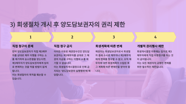 따라서 채권자는 회생절차 중에 회생담보권자로서 임의로 제3채무자에게 직접 지급을 청구하여 변제를 받을 수 없고, 회생절차의 집단적 조정에 따라 회생담보권 신고 및 회생계획에 따른 변제를 받아야 한다. 결론적으로 회생개시결정 이후 양도담보권자가 제3채무자를 상대로 매출채권 지급을 구하는 직접 이행청구는 금지된다.