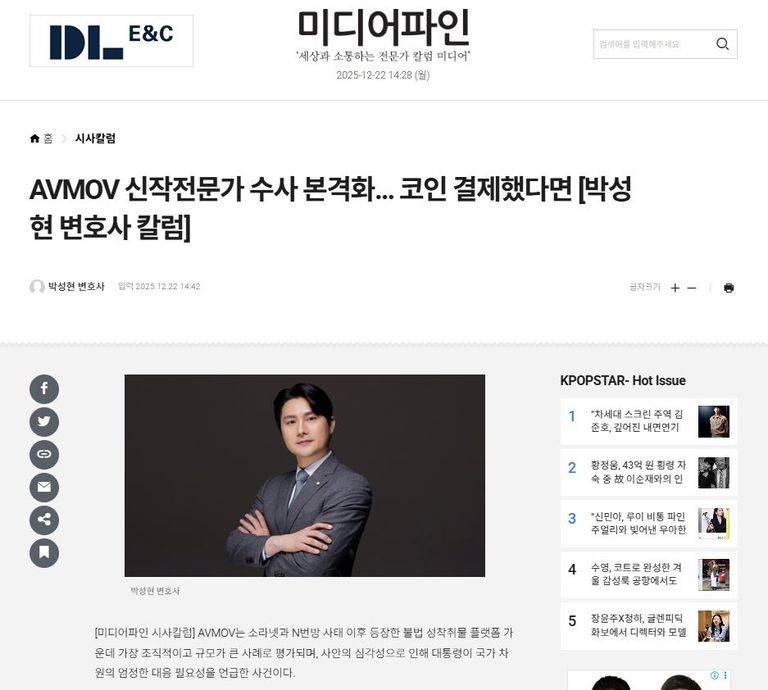 다만 실무적으로는 AVMOV에 게시된 모든 영상이 모든 시점마다 전부 채증돼 있을 가능성은 높지 않다는 분석도 나온다. 고가 영상까지 포함해 전체 자료를 완전히 확보하는 데에는 수사 비용과 기술적 한계가 따를 수밖에 없기 때문이다. 결국 실제 수사나 재판 과정에서는 어떤 영상이 증거로 특정되는지가 사안마다 다르게 판단될 수밖에 없다는 점에서, 이용 이력이 문제 될 수 있는 상황이라면 초기 단계부터 구체적인 대응 방향을 점검할 필요가 있다.(법률사무소 유(唯) 박성현 변호사)